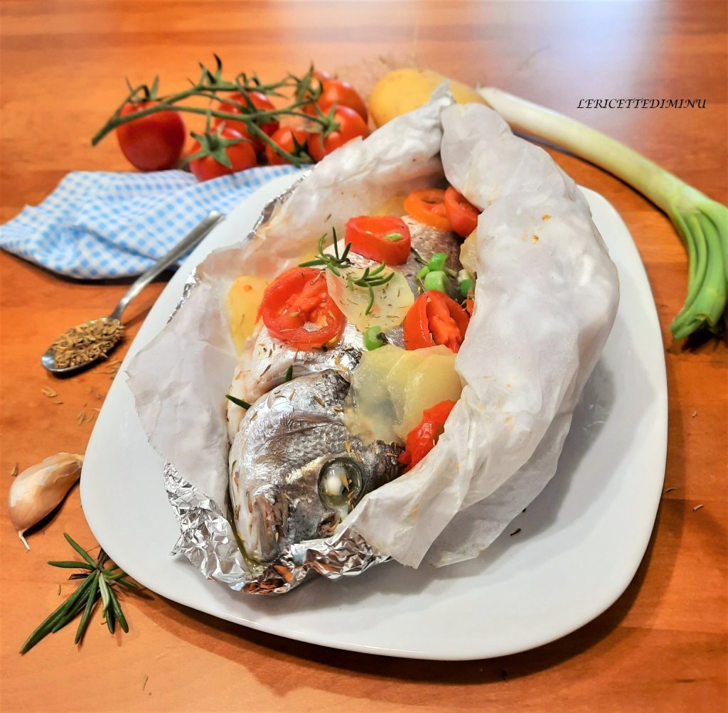 O dourado no papelote com tomatinhos e batatas está pronto.