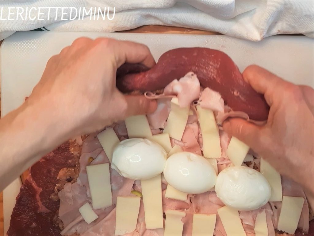 Enrole a fatia de carne sobre si mesma, tendo cuidado de manter os ovos bem posicionados.