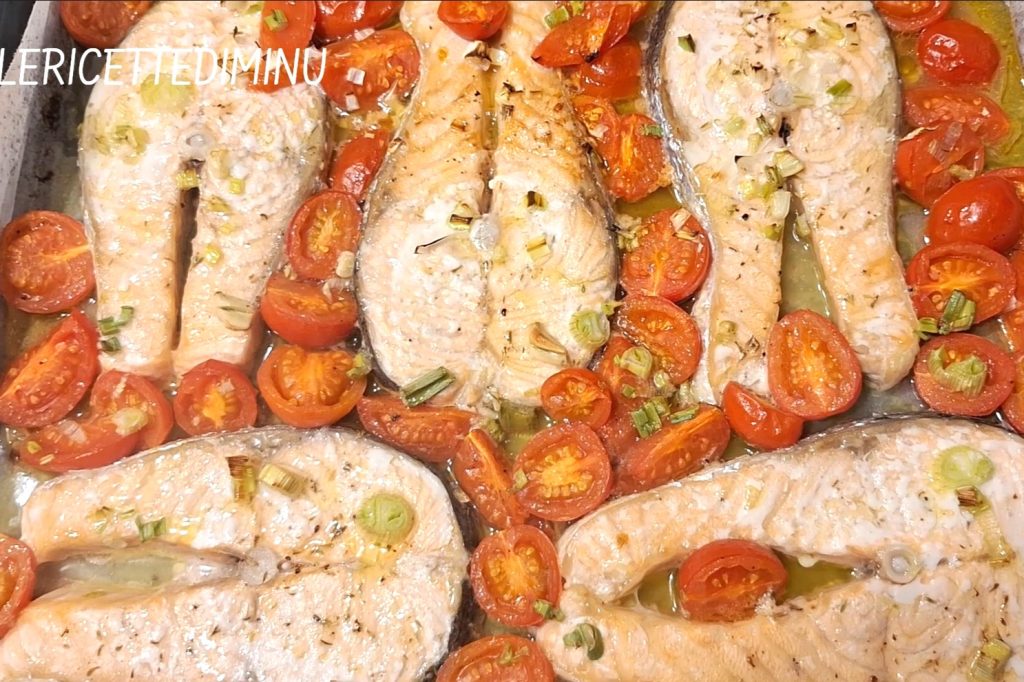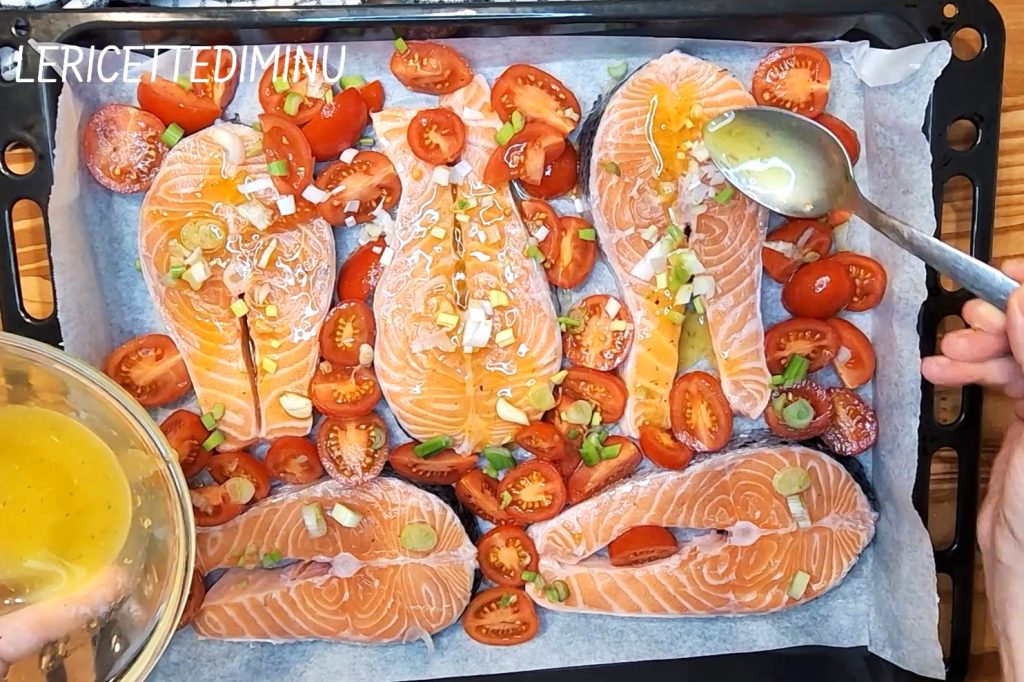 Preparando as fatias de salmão conforme a receita indicada a seguir, de forma simples e rápida, você pode obter fatias saborosas e tenras acompanhadas de tomatinhos, cujo sabor ligeiramente ácido contrasta bem com a carne deste peixe, realçando seu sabor.
