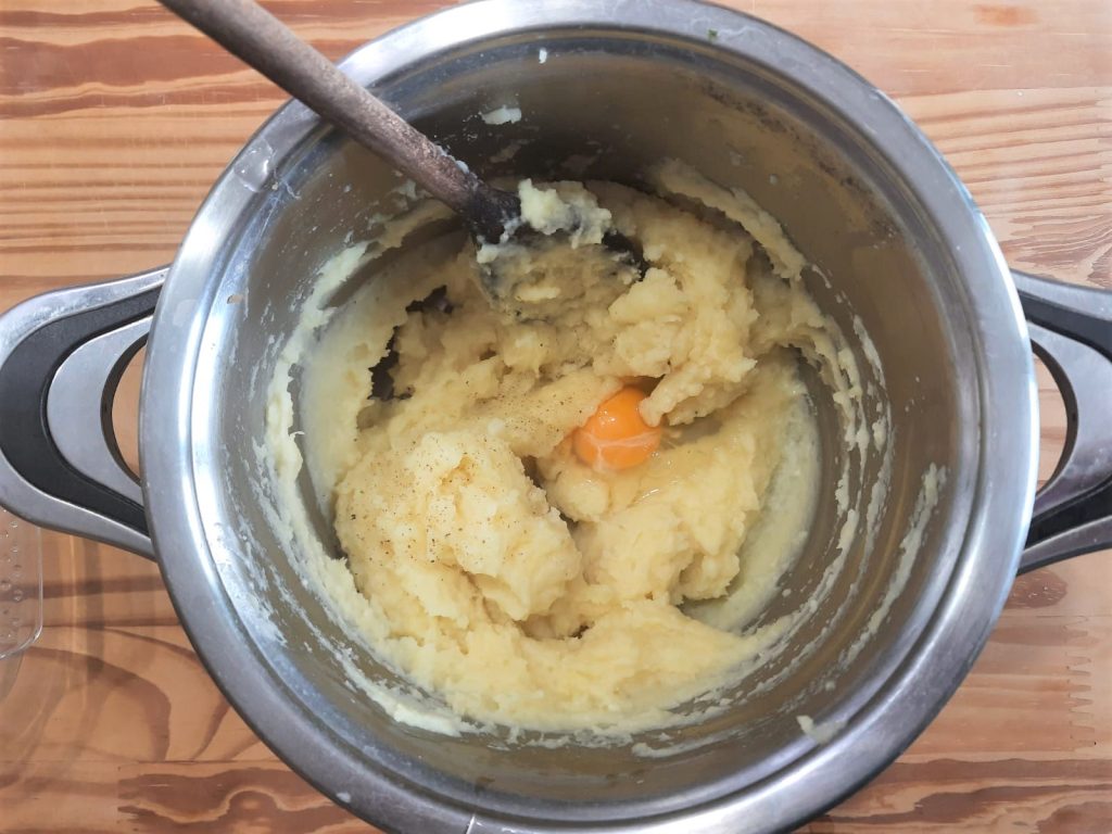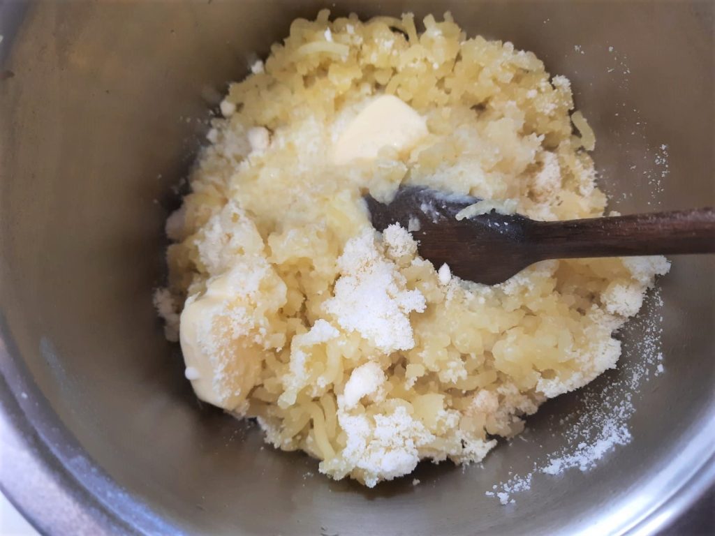 Adicione às batatas já amassadas, o leite, o pedaço de manteiga e o parmesão ralado (deixando 4 colheres de sopa para depois), misture e reserve por um momento.