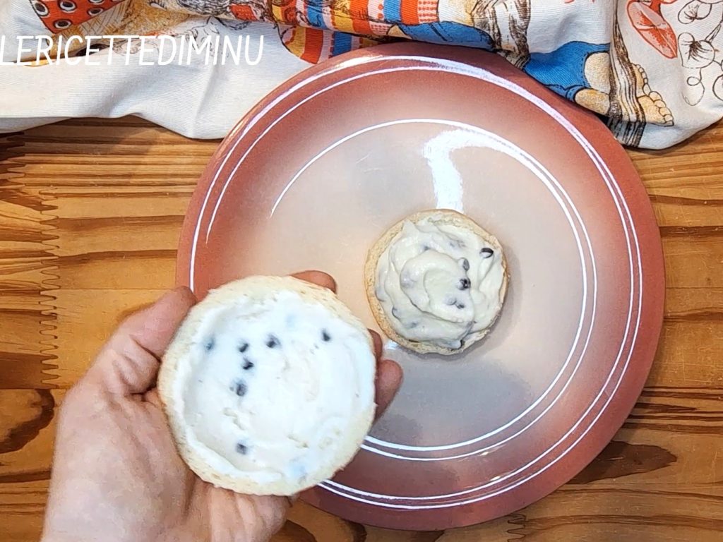 Com a ajuda de uma colher de chá, preencha com o creme de ricota tanto a parte superior quanto a inferior do pão e depois una as duas partes, tentando fazer com que se encaixem bem.