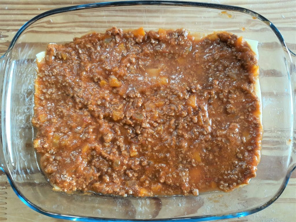 A lasanha com ragu à bolonhesa e bechamel está pronta.