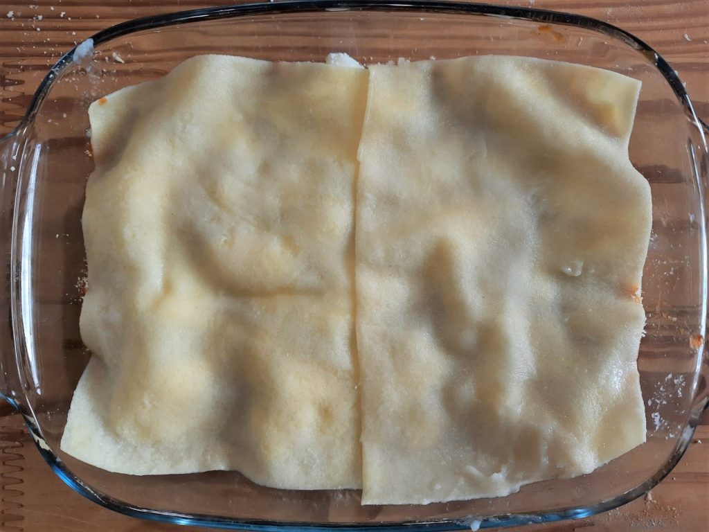 - 8 folhas lasanha (prontas ou feitas em casa com 250 gramas de farinha e 125 ml de água)