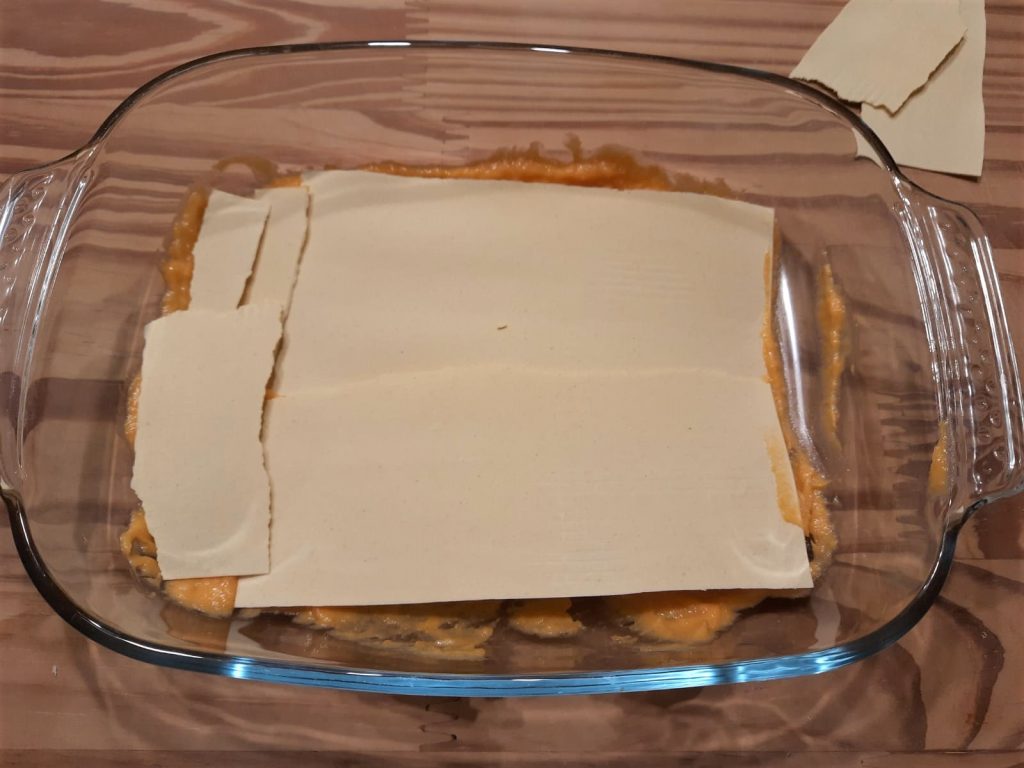 Espalhe o molho bechamel de abóbora no fundo de uma assadeira, coloque as folhas de lasanha por cima, sem deixar espaços vazios.