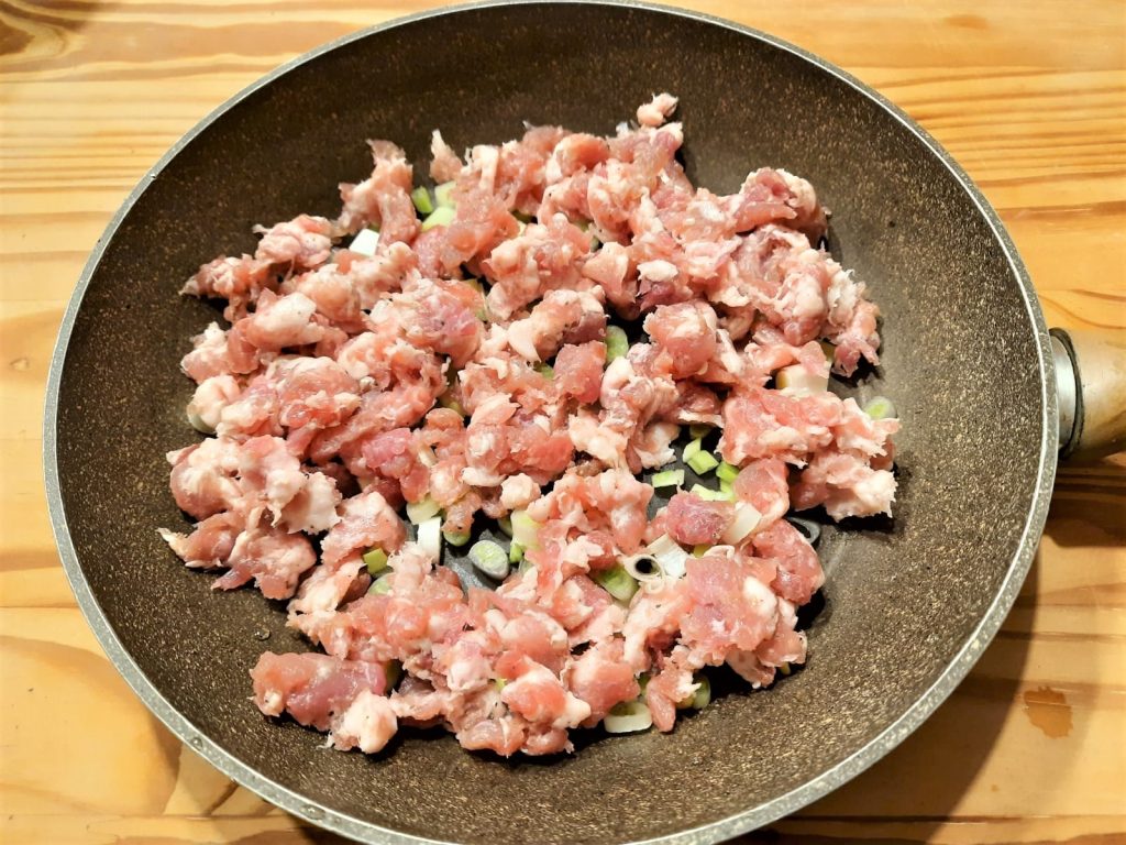 Enquanto isso, em uma frigideira antiaderente, fatie a cebolinha, adicione a linguiça retirada da tripa e esmigalhada.