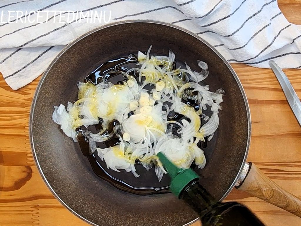 Fatie finamente a cebola com a mandolina e pique o alho, colocando ambos em uma panela antiaderente.