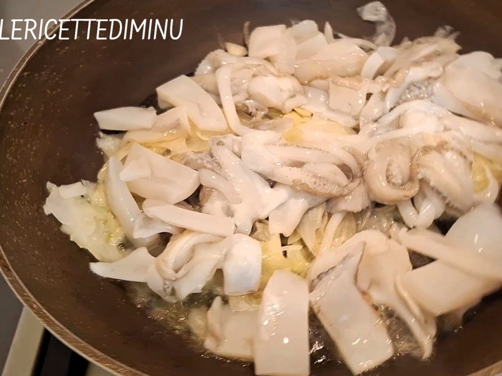 Adicione os pedaços de lula na panela, junte uma quantidade generosa de azeite de oliva e refogue tudo em fogo moderado, mexendo frequentemente com uma colher de pau.