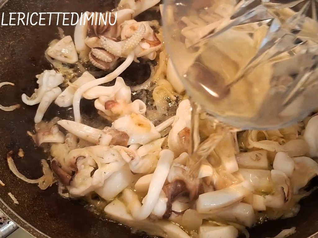 Continue assim por cerca de 5 minutos, depois adicione meio copo de vinho branco e deixe evaporar em fogo alto.