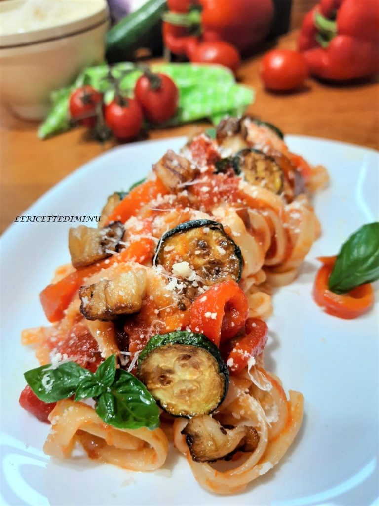 O macarrão com pimentões, abobrinha e berinjela é um prato delicioso ao qual tenho muito carinho. Era uma das inúmeras receitas da minha mãe, que no verão adorava incluir entre os pratos de domingo que nos oferecia alternadamente.