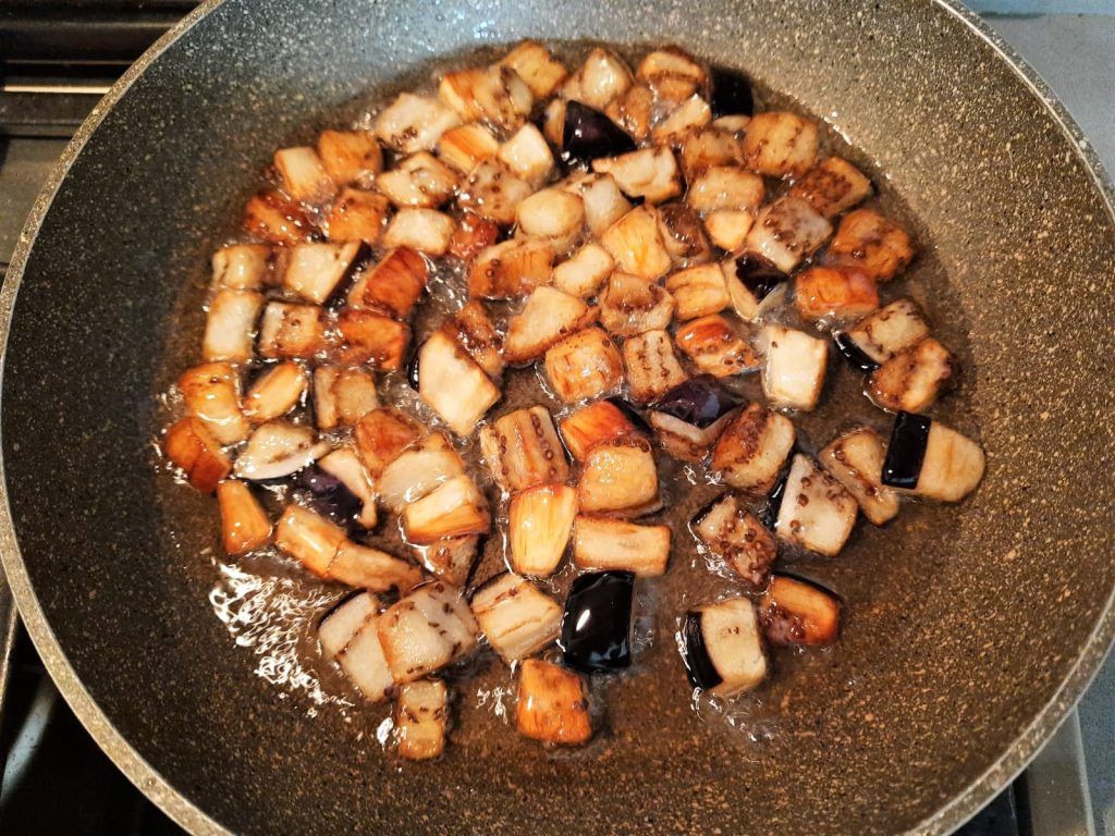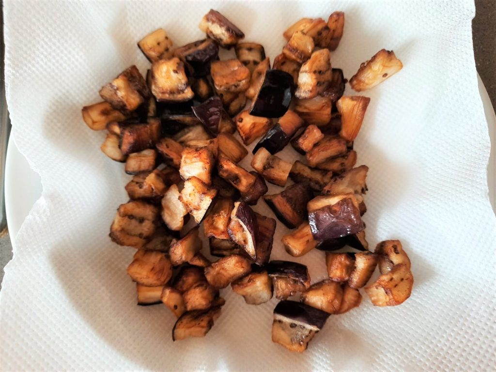 Em óleo quente, frite depois a berinjela após lavá-la do sal e secá-la bem com um pano de prato. Coloque depois em papel absorvente.
