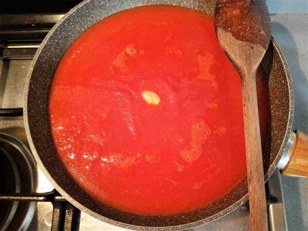 Coloque o molho no fogo para engrossar com um dente de alho grande esmagado. Quando atingir a fervura, salgue e mexa.