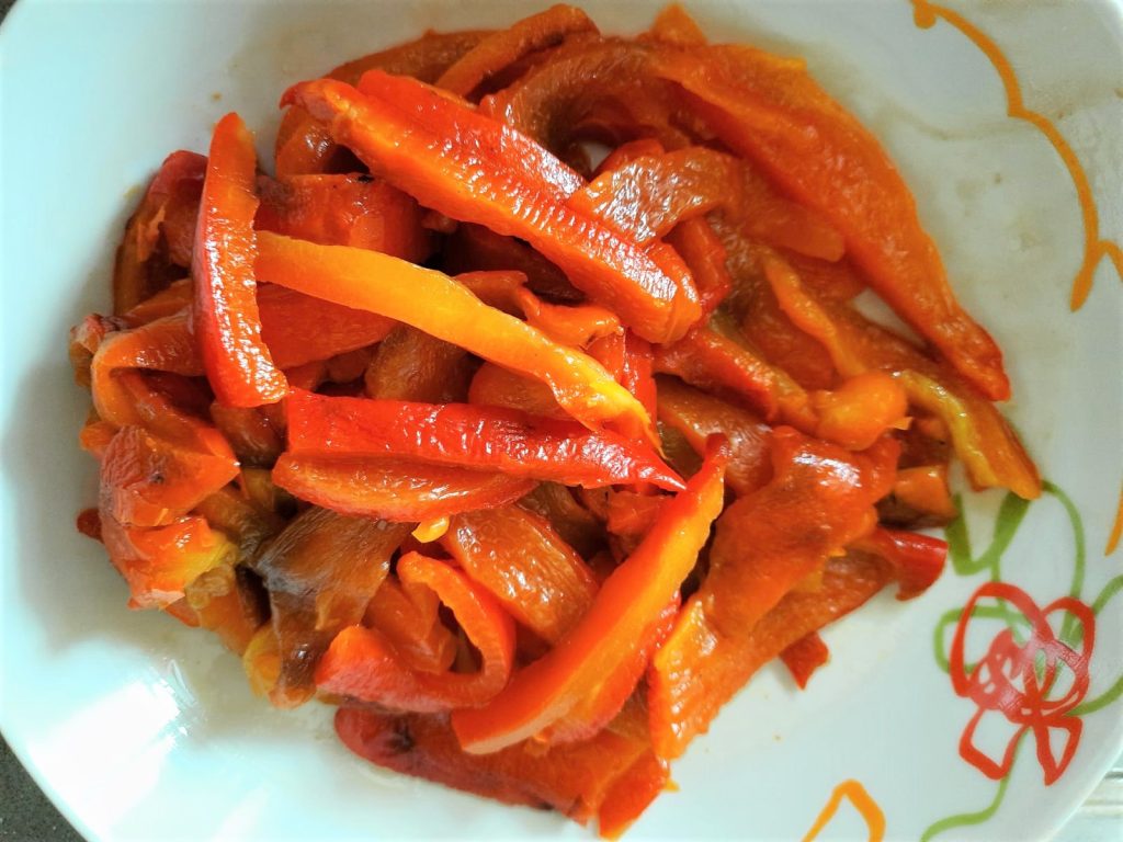 Após cerca de 20 minutos ou mais, comece a descascar os pimentões, removendo também todas as sementinhas. Corte-os em tirinhas.