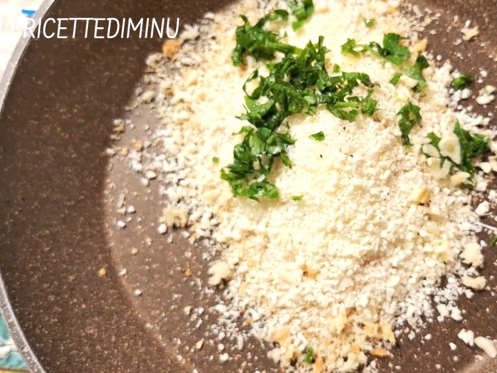 Numa frigideira antiaderente, junte a farinha de rosca, o pecorino ralado (ou parmesão), a salsinha e o alho finamente picados, uma pitada de sal fino e pimenta-do-reino moída.