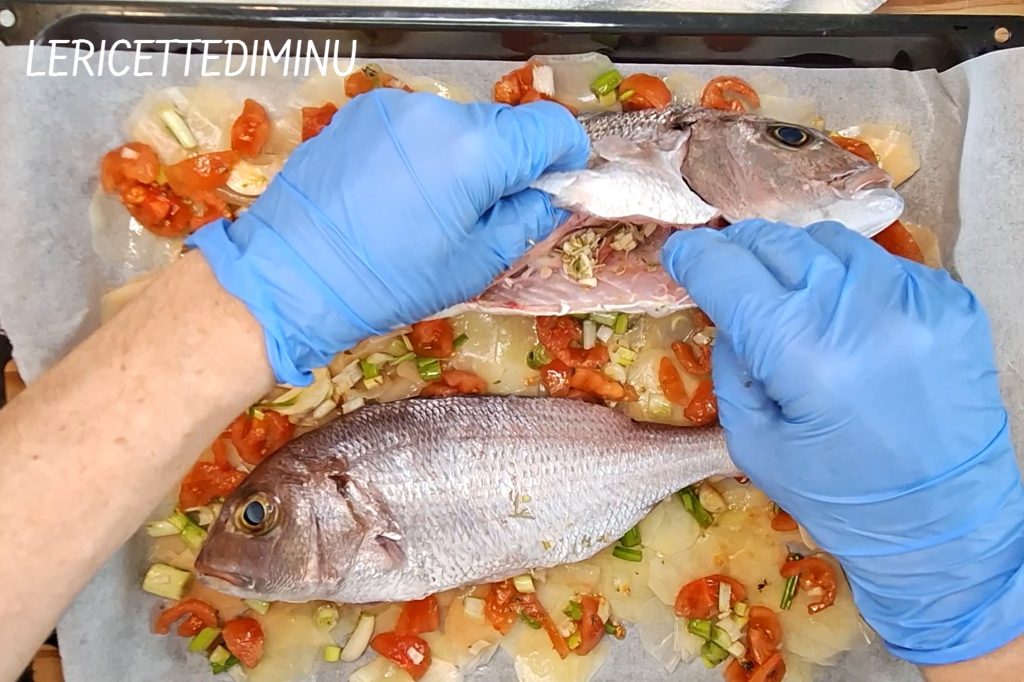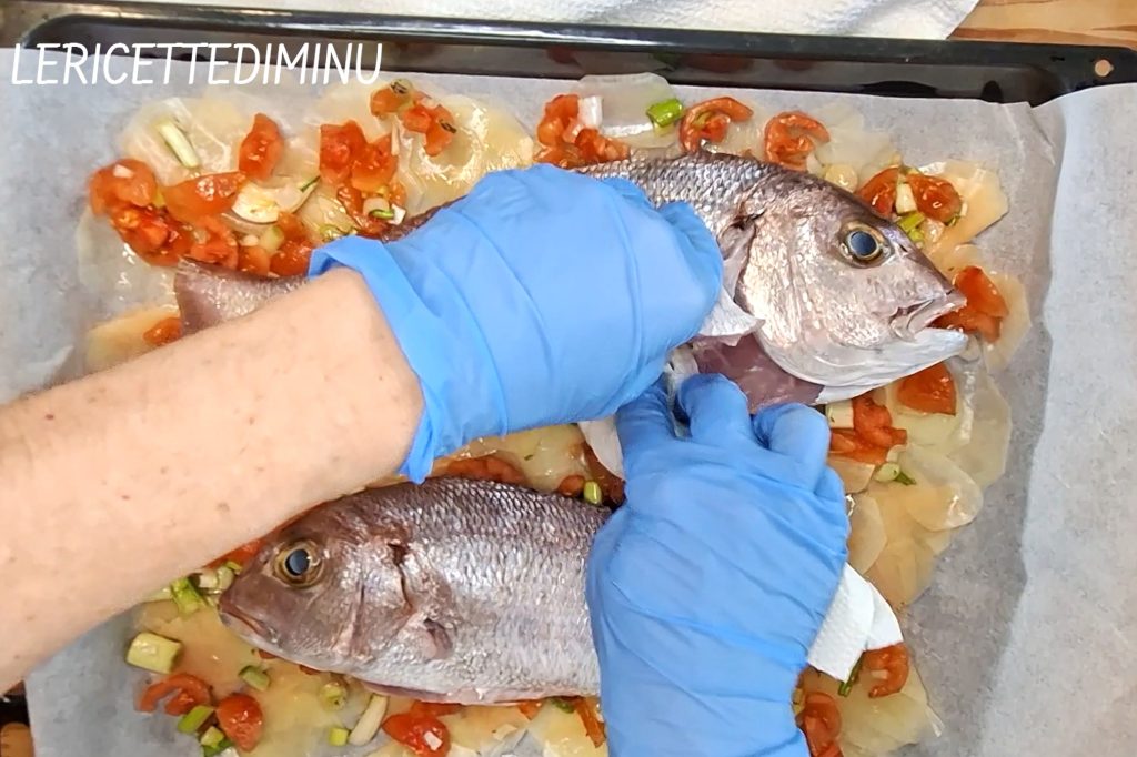 A preparação prevê uma base de batatas cortadas em fatias finas com a mandolina, que durante o cozimento ficam macias e levemente douradas, absorvendo os sucos do peixe.