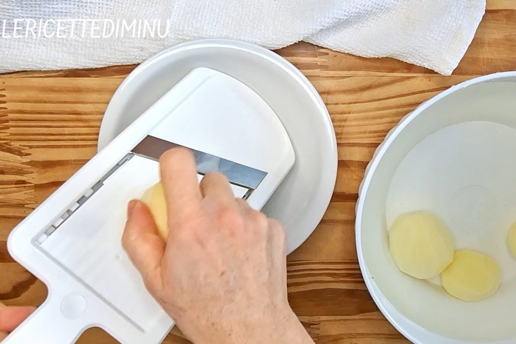 Para preparar o pagro ou pauro assado com batatas, lave e descasque as batatas, depois corte-as em fatias com a mandolina.