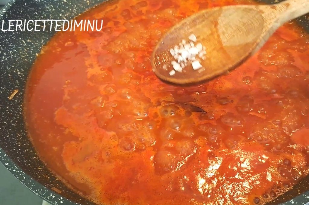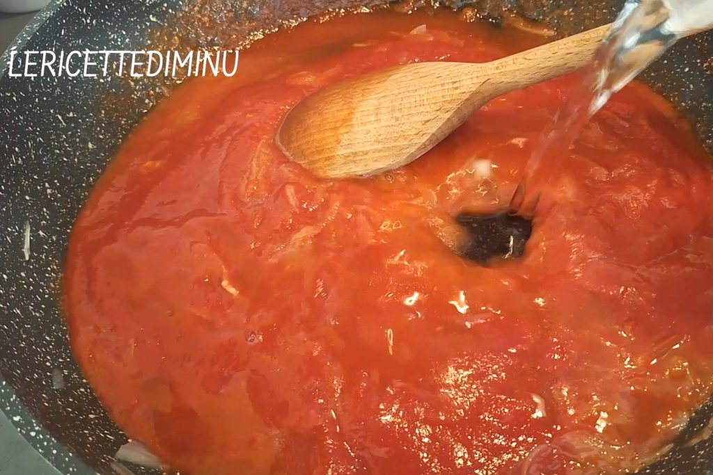Quando a cebola estiver macia, adicione à panela o purê de tomate, um pouco de água e um pedaço de pimenta vermelha picante. Tampe com a tampa, deixando uma saída lateral.