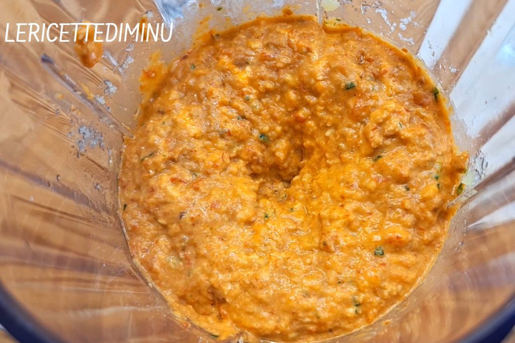 No copo do liquidificador, junte os pimentões, um dente de alho, cerca de 8 folhas de manjericão, as amêndoas, o parmesão (que pode ser substituído por grana ou pecorino), o azeite extravirgem e uma pitada de sal. Este último pode ser omitido, especialmente se usar pecorino.