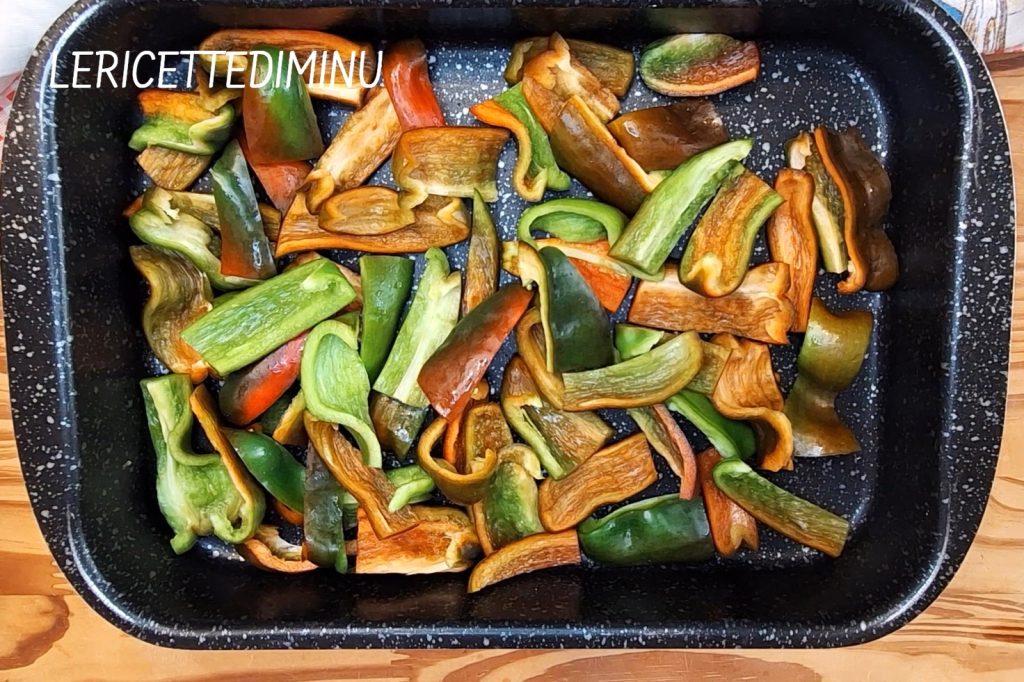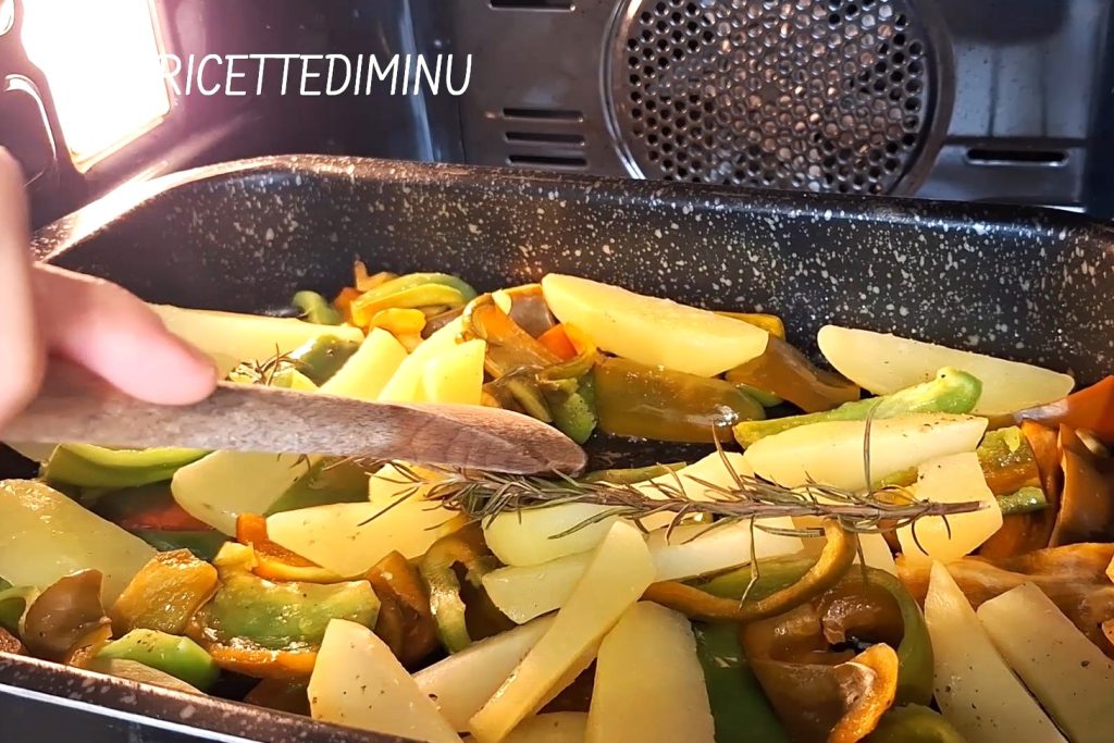 Quando ao perfurá-los com um garfo, tanto as batatas quanto os pimentões estiverem macios, suba a assadeira para a parte superior do forno. Ative a função grill e continue a cocção por mais 5 ou 10 minutos, até que os vegetais estejam dourados.
