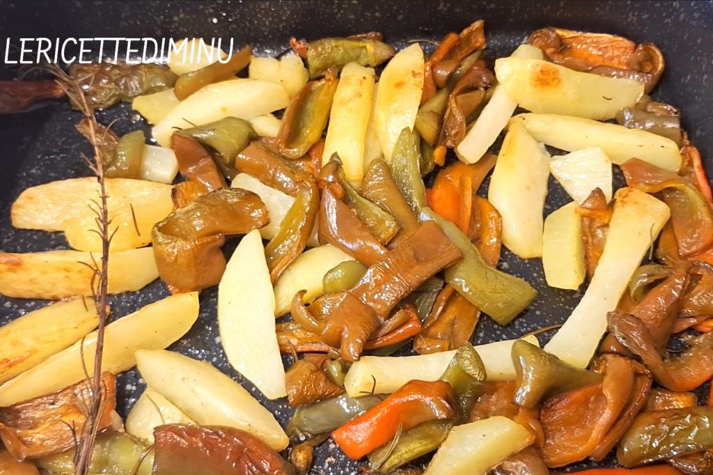 Numa assadeira antiaderente, misture pimentões e batatas, adicione um ramo de alecrim, azeite, pimenta-do-reino preta moída na hora e uma pitada moderada de sal.
