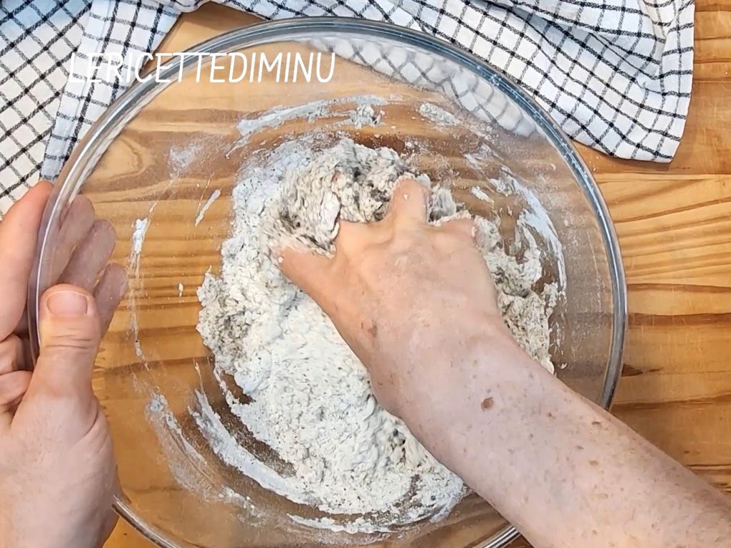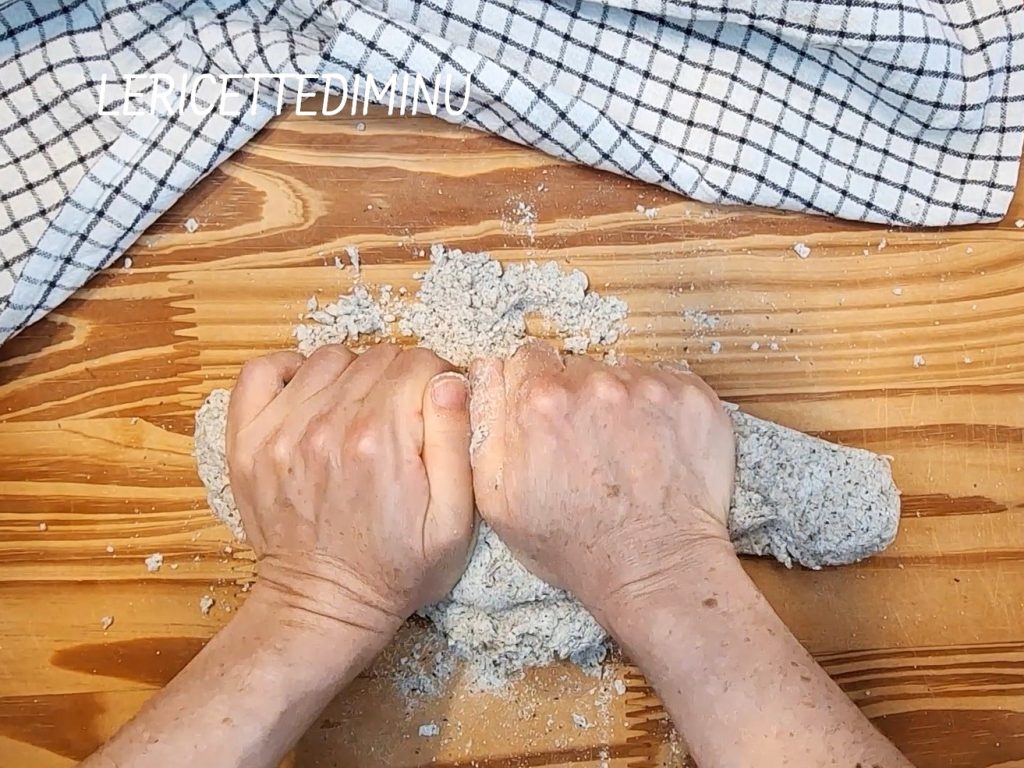 Continue a amassar por pelo menos dez minutos até que os ingredientes estejam bem ligados entre si.