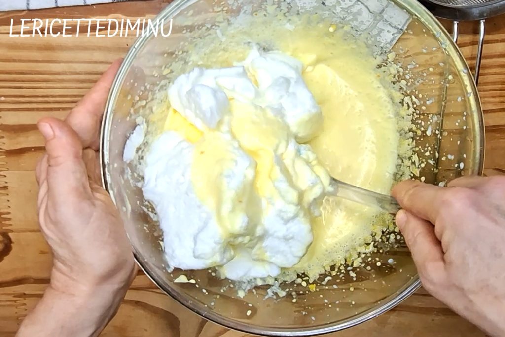 Em seguida, adicione as claras, misturando a mistura com a espátula.