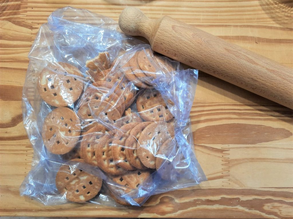 Coloque os biscoitos em um saco para congelamento e esmague-os grosseiramente com um rolo ou uma garrafa.