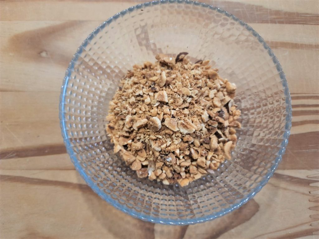 Para preparar o salame de chocolate sem ovos e sem licor, triture as avelãs torradas no mixer após remover a película.