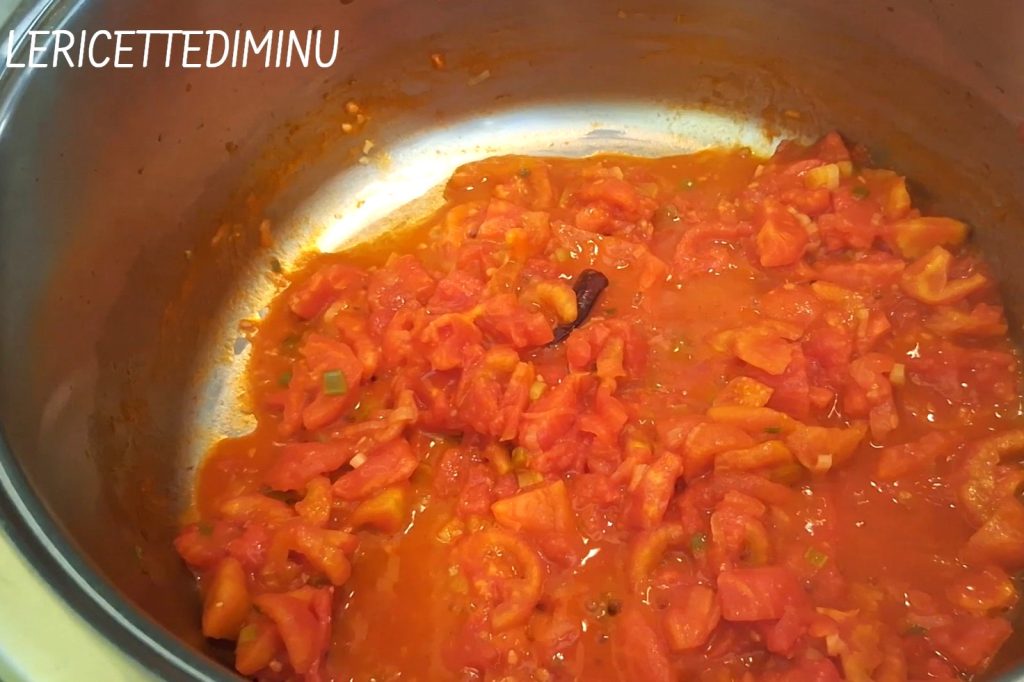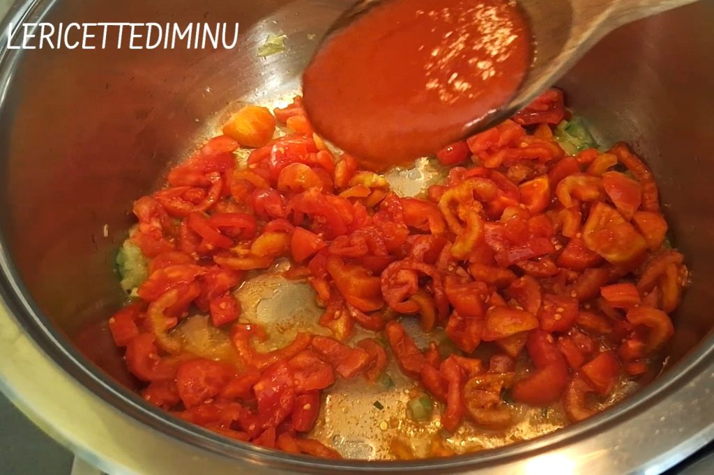 Quando a cebola estiver murcha, adicione os tomates, algumas colheradas de purê de tomate e um pedacinho de pimenta. Mexa.