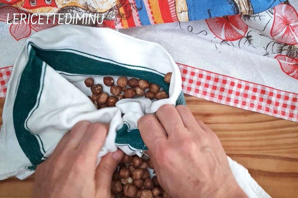 Assim que começarem a cheirar a torrado e apresentarem um leve dourado, retire as avelãs do forno e coloque-as imediatamente em um pano de cozinha úmido e bem torcido. Comece a esfregar as avelãs para que percam grande parte da pele que as cobre.
