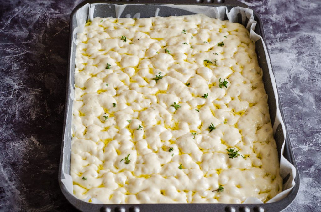 O preparo é muito simples e requer uma lista mínima de ingredientes: misturamos na tigela a farinha com o fermento dissolvido na água e adicionamos o açúcar ou uma colher de chá de mel. Amassamos com uma colher e adicionamos primeiro o óleo e depois, por último, o sal. Obteremos uma massa mole e pegajosa. Deixamos a massa descansar por 5 minutos, depois fazemos a primeira dobra na tigela dobrando um lado da massa sobre si mesma, então giramos a tigela um quarto e repetimos esta operação em um outro lado da massa e, sempre girando a tigela um quarto, dobramos outro lado da massa sobre si mesma. Fazemos esta dobra mais duas vezes com um intervalo de 20 minutos entre cada uma. Depois colocamos a massa em uma tigela untada com óleo, cobrimos com filme plástico e colocamos na geladeira por pelo menos 10-12 horas ou uma noite. No dia seguinte, trazemos à temperatura ambiente por pelo menos uma ou duas horas, então colocamos em uma assadeira bem untada ou forrada com papel manteiga e deixamos fermentar por mais uma hora até que a massa cubra toda a superfície da assadeira. Despejamos bastante óleo sobre a massa da focaccia e pressionamos com os dedos untados de óleo para fazer as clássicas covinhas da focaccia. Polvilhamos com folhas de tomilho e sal e levamos ao forno a 230 graus por cerca de 25-30 minutos.