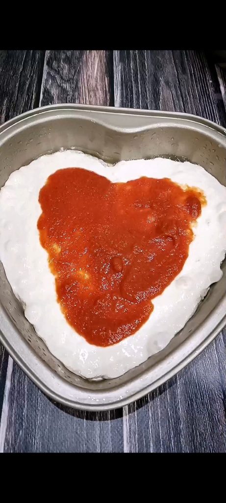 Prepare a Pizza em forma de coração começando pela base seguindo a receita com vídeo e fotos que você encontra aqui: PIZZA SEM MASSA (ou como alternativa Pizza com farinha de espelta, sem glúten, de longa fermentação ou integral.) Forre uma forma em forma de coração com papel manteiga ou unte bem e estenda a massa da pizza. Tempere com o molho de tomate, sal, orégano e azeite.