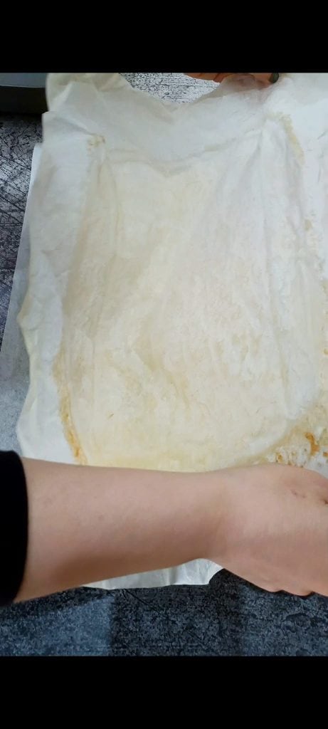 Retire a omelete do forno e vire-a sobre a bancada em um papel manteiga limpo. Remova delicadamente o papel manteiga utilizado para o cozimento e deixe amornar.
