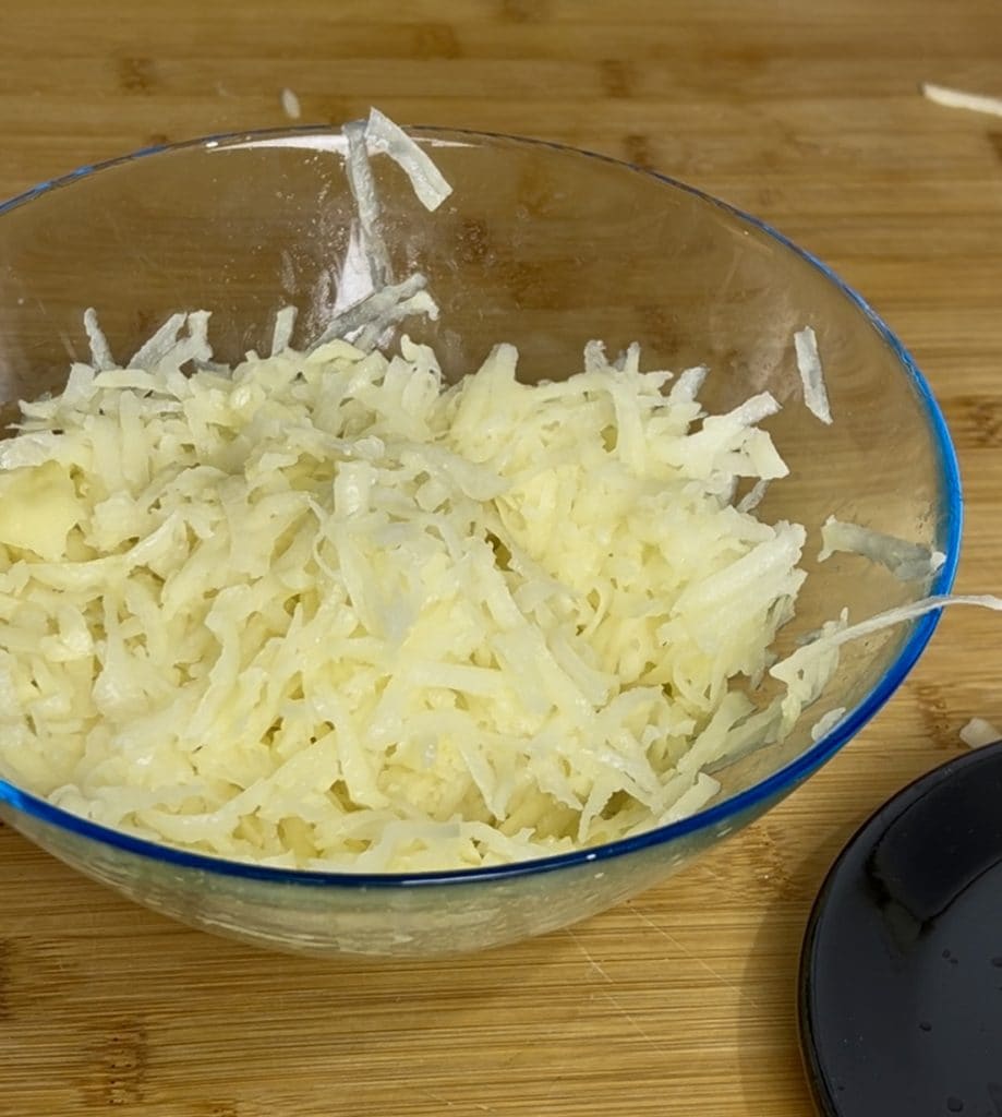 Assim como ele, esta receita é simples, mas com um toque inesperado: usei batatas cortadas em julienne, temperei bem e transformei em uma espécie de rösti crocante e derretido. No centro, um coração de muçarela que derrete com o calor, enquanto na superfície, o parmesão ralado cria uma crosta dourada irresistível. O resultado? Uma batata especial, perfeita como entrada, prato vegetariano ou petisco para um jantar com amigos.