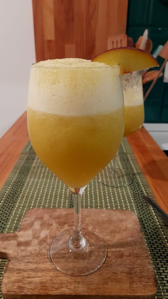 A preparação desse coquetel é realmente simples e rápida: basta usar um liquidificador para a polpa do pêssego, preencher o cálice com o pêssego em 1/3 e adicionar Prosecco gelado para encher o cálice.