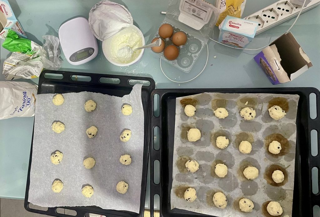 Conforme você forma as bolinhas, coloque-as na assadeira coberta com papel manteiga. Nós usamos duas assadeiras, mas você pode apertá-las um pouco, pois elas crescerão um pouco ao assar, mas não muito. Quando todas as bolinhas estiverem formadas, leve ao forno preaquecido a 180° por cerca de 12 minutos, devem estar levemente douradas, mas não muito, e é normal se parecerem macias ao toque, pois secarão um pouco enquanto esfriam.