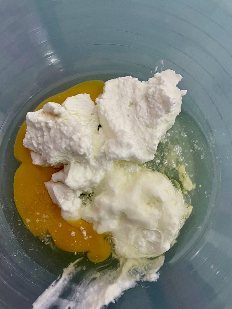 Comece a massa colocando na tigela o ovo, o açúcar e o iogurte. Misture os ingredientes com o batedor até que fiquem homogêneos.