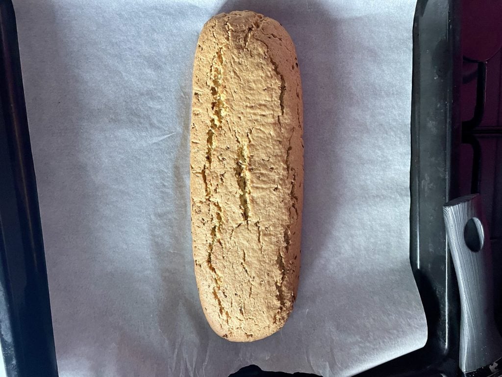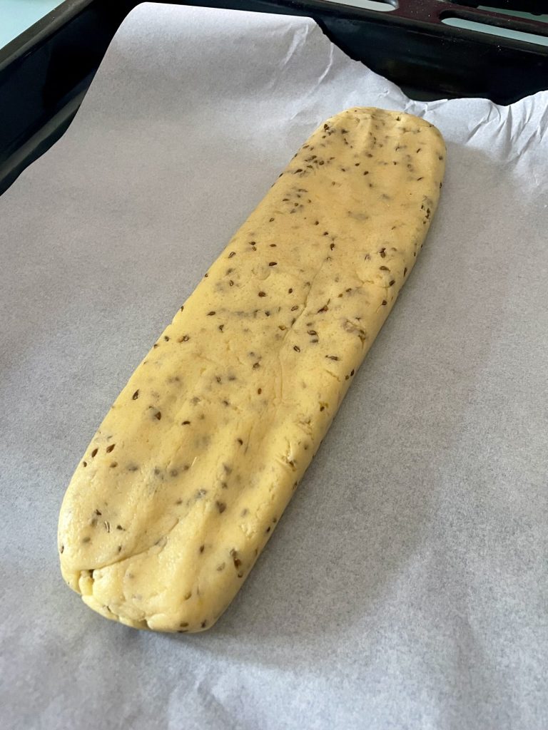 Coloque o cilindro de massa em uma assadeira coberta com papel manteiga e asse em forno já aquecido a 180°C por cerca de 25/30 minutos ou até que fique dourado, como visto na foto.