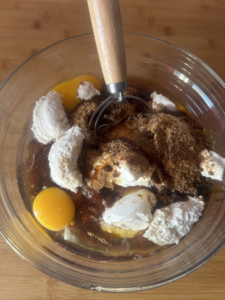 Coloque todos os ingredientes na tigela de vidro, a manteiga ou margarina não deve ser derretida, mas bem macia, eu coloco no micro-ondas por cerca de 15 segundos antes de adicioná-los aos outros ingredientes.
