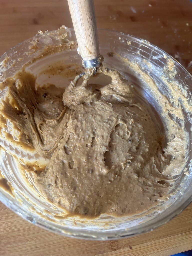 Misture todos os ingredientes com o batedor manual, você verá que o fermento natural “se dissolve” facilmente. Se posso dar uma dica, compre este batedor, é barato e para massas feitas à mão é realmente muito útil.
