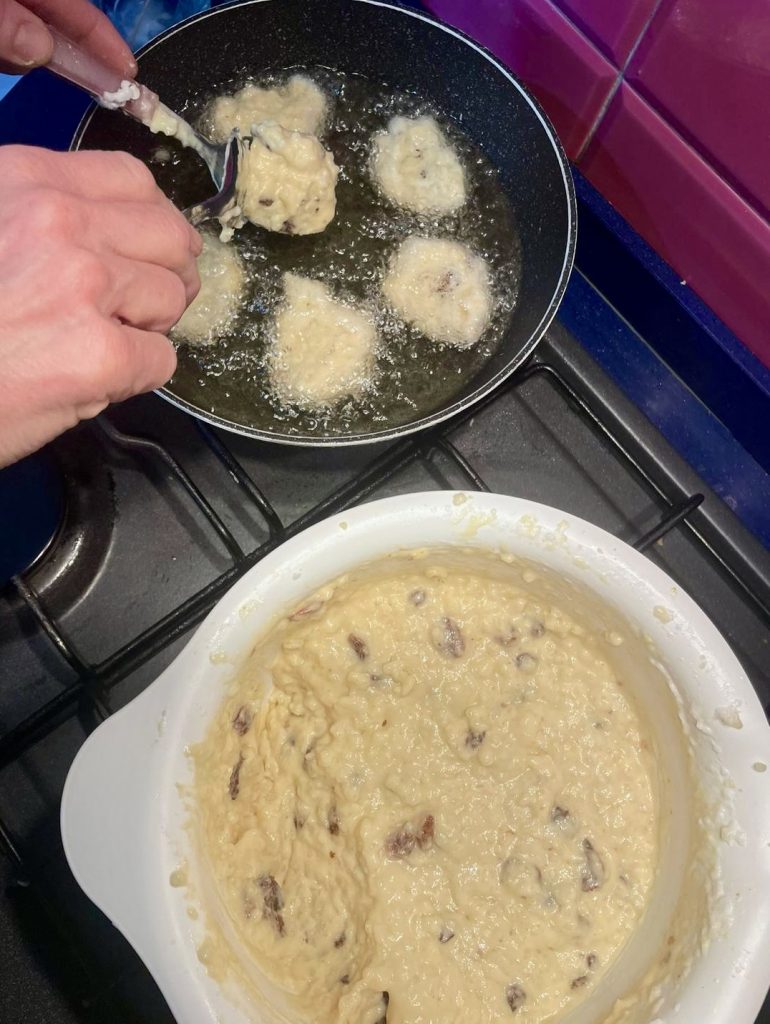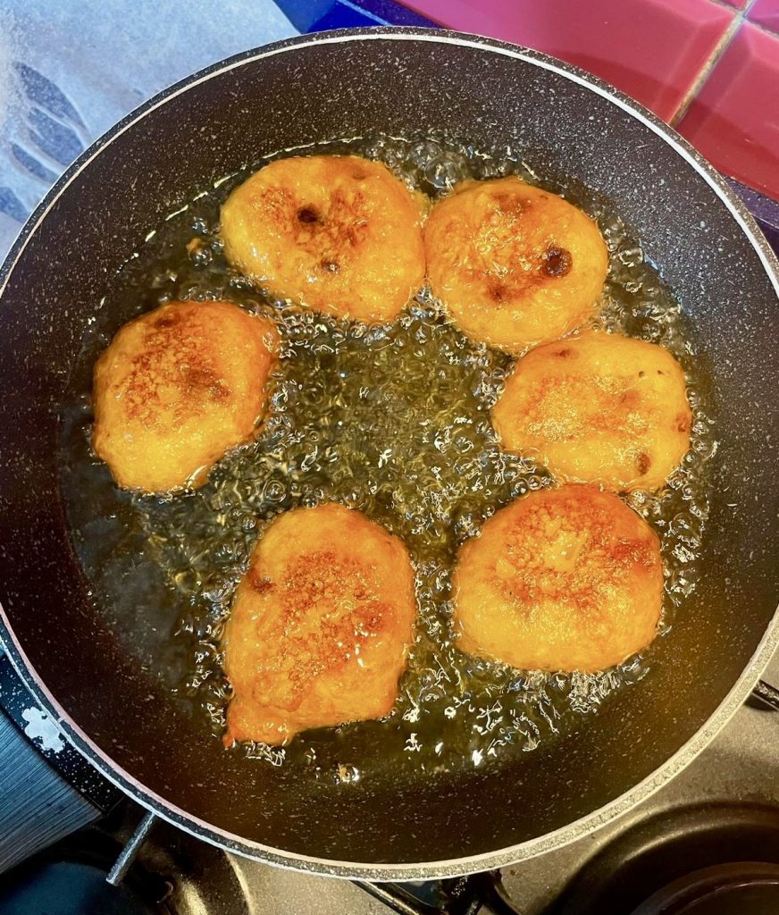 Aqueça o óleo em uma frigideira para fritar e, quando estiver bem quente, pegue a massa com a ajuda de duas colheres para formar os bolinhos. Frite-os de ambos os lados até dourarem completamente.