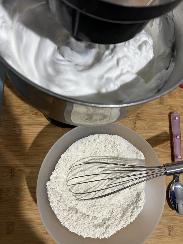 Desligue a batedeira e, à mão, em várias etapas, adicione a farinha e o açúcar às claras batidas.