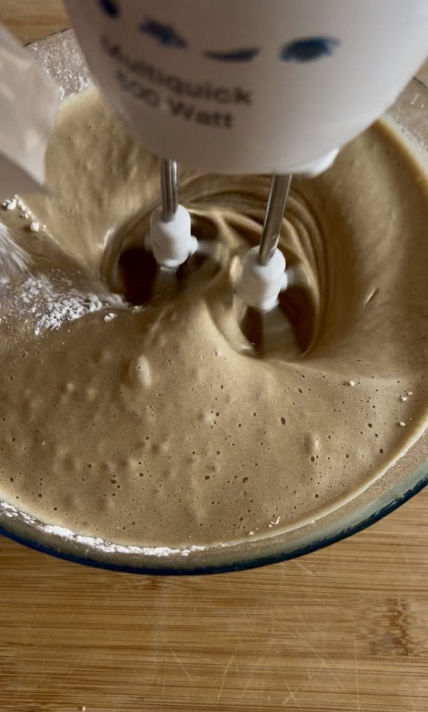 Continue batendo com a batedeira e adicione o café aos poucos.