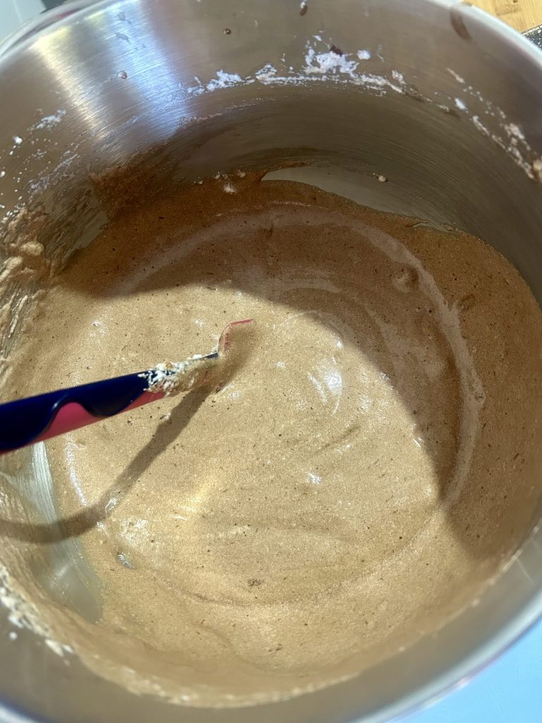 No restante da mistura, adicione mexendo com um batedor a farinha restante e o pacote de fermento.