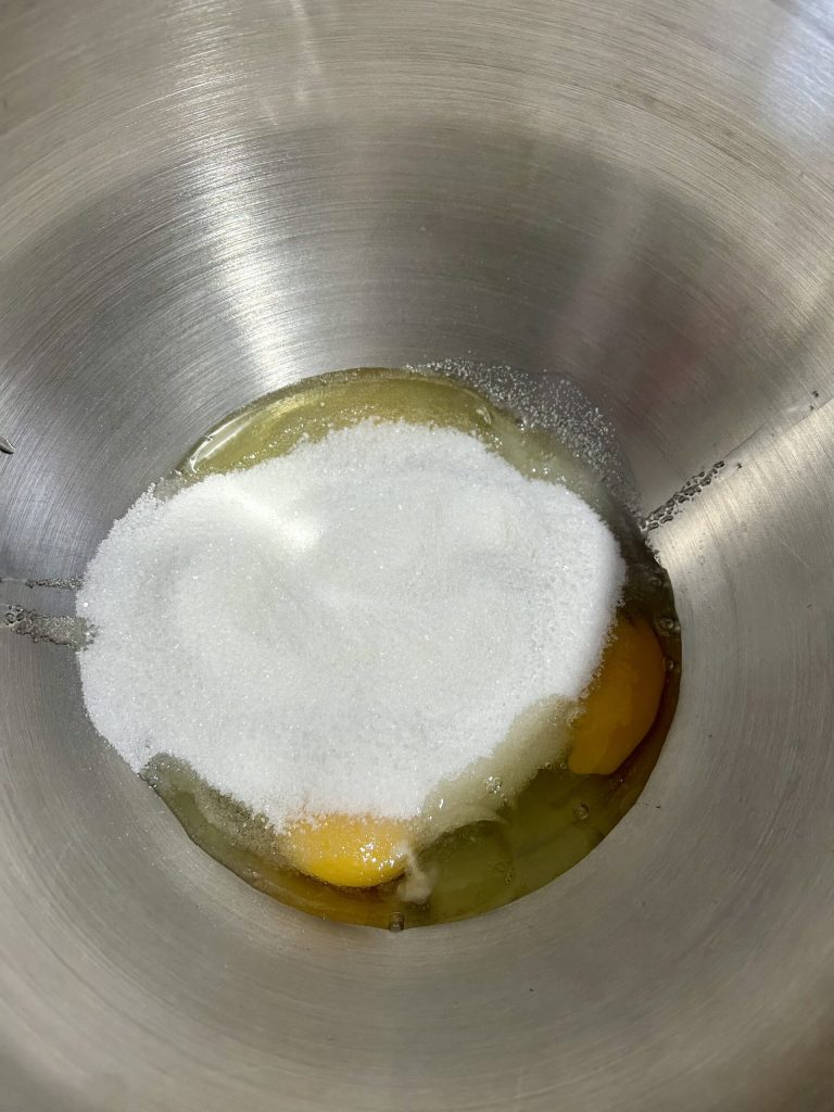 Agora precisamos cuidar da massa. Comece colocando os ovos na tigela da batedeira com o açúcar e bata bem até que os ovos fiquem esbranquiçados. Quando estiverem bem montados, adicione, sempre mexendo, o óleo, o suco da lata de abacaxi, a vanilina, a farinha e, por último, o fermento. Se restarem fatias de abacaxi na lata, você pode cortá-las em pedaços e adicioná-las à massa.