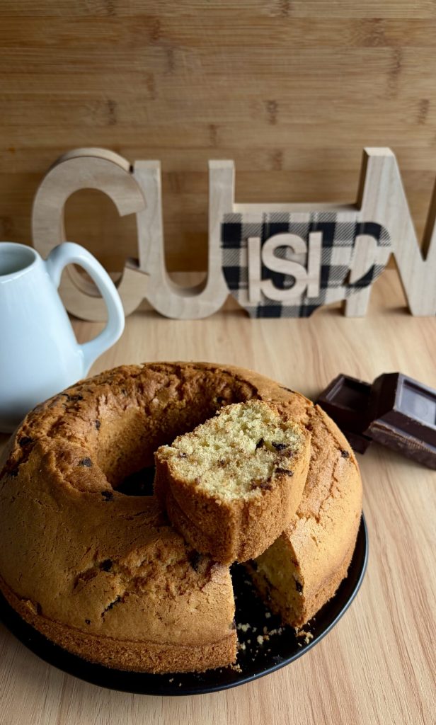 Um lanche improvisado, poucos ingredientes na despensa e uma fritadeira a ar ligada: assim nasceu este bolo fofo, leve e cheio de gotas de chocolate que conquistou adultos e crianças na primeira mordida.