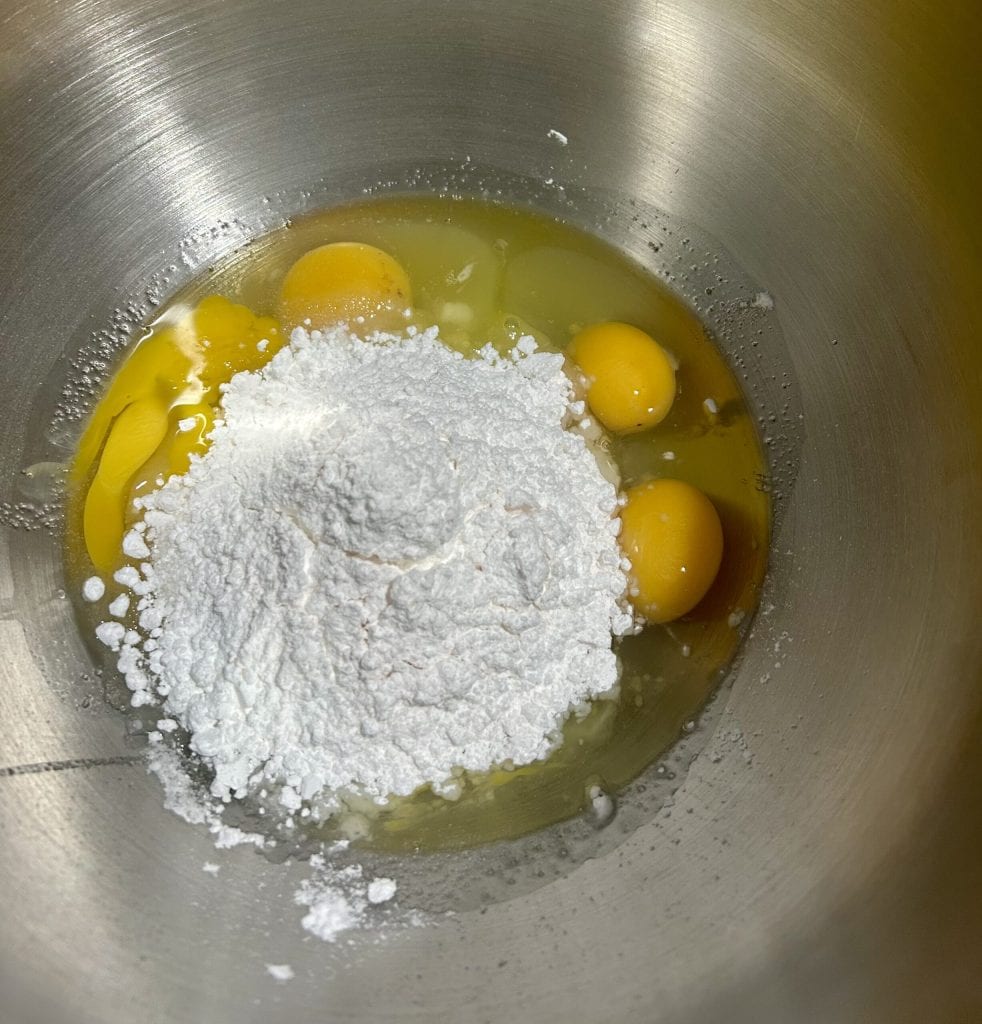 A primeira etapa consiste em deixar as sementes de anis de molho no óleo. Isso pode ser feito até várias horas antes ou enquanto você prepara os outros ingredientes; enfim, é aconselhável deixá-los amolecer um pouco. Na tigela da batedeira, coloque os ovos junto com o açúcar granulado e o açúcar de confeiteiro aromatizado com baunilha. Ligue a batedeira em velocidade média, usando o gancho de folha para massas de consistência média.