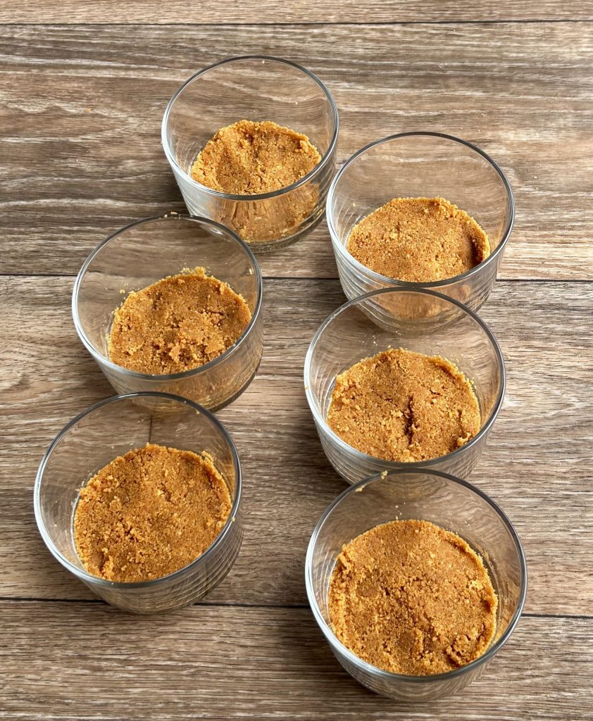 Com o creme preparado, cubra todas as bases tentando pressionar um pouco o creme com a base da colher para preencher todos os espaços vazios acima da base de biscoito e alise o melhor possível a superfície.