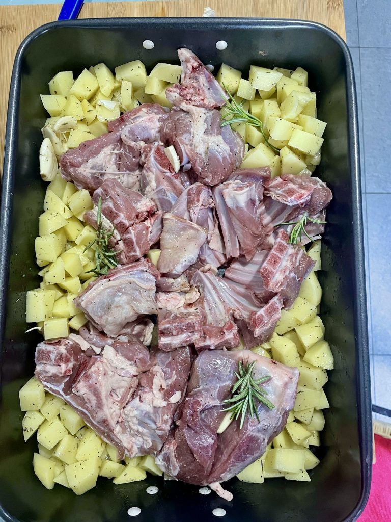 Retomamos o cordeiro marinado e o colocamos sobre as batatas na assadeira. Colocamos no forno já aquecido a 220°C e deixamos assar por cerca de 1 hora e 30 minutos, até que a carne fique crocante por fora. Quando um lado estiver bem dourado, viramos delicadamente o cordeiro e misturamos as batatas com uma colher sem quebrá-las, para que tudo doure de maneira uniforme. Para um cozimento perfeito, colocamos a assadeira na grade mais baixa do forno, mas sem tocar diretamente na resistência.