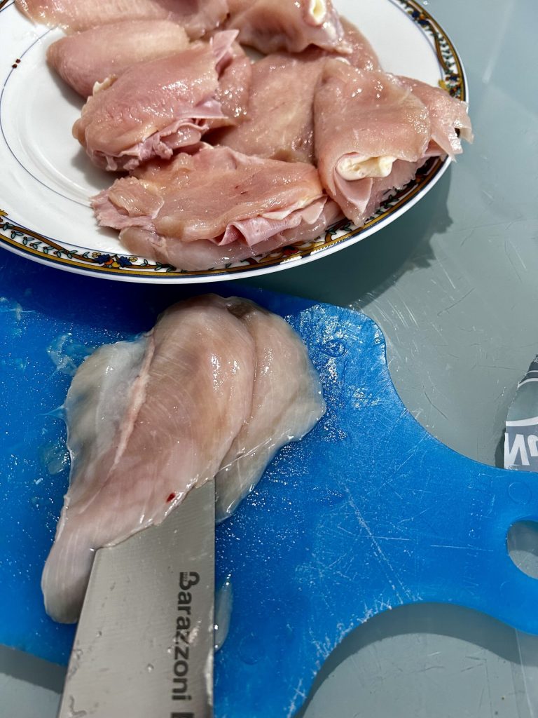 Divida o seu peito de frango em seis partes mais ou menos iguais e, em cada pedaço, crie um grande bolso, sem separar em dois pedaços, mas deixando um lado unido. Se estiver muito grosso, você pode afinar cada aba com o martelo de carne ou com a ponta da faca.