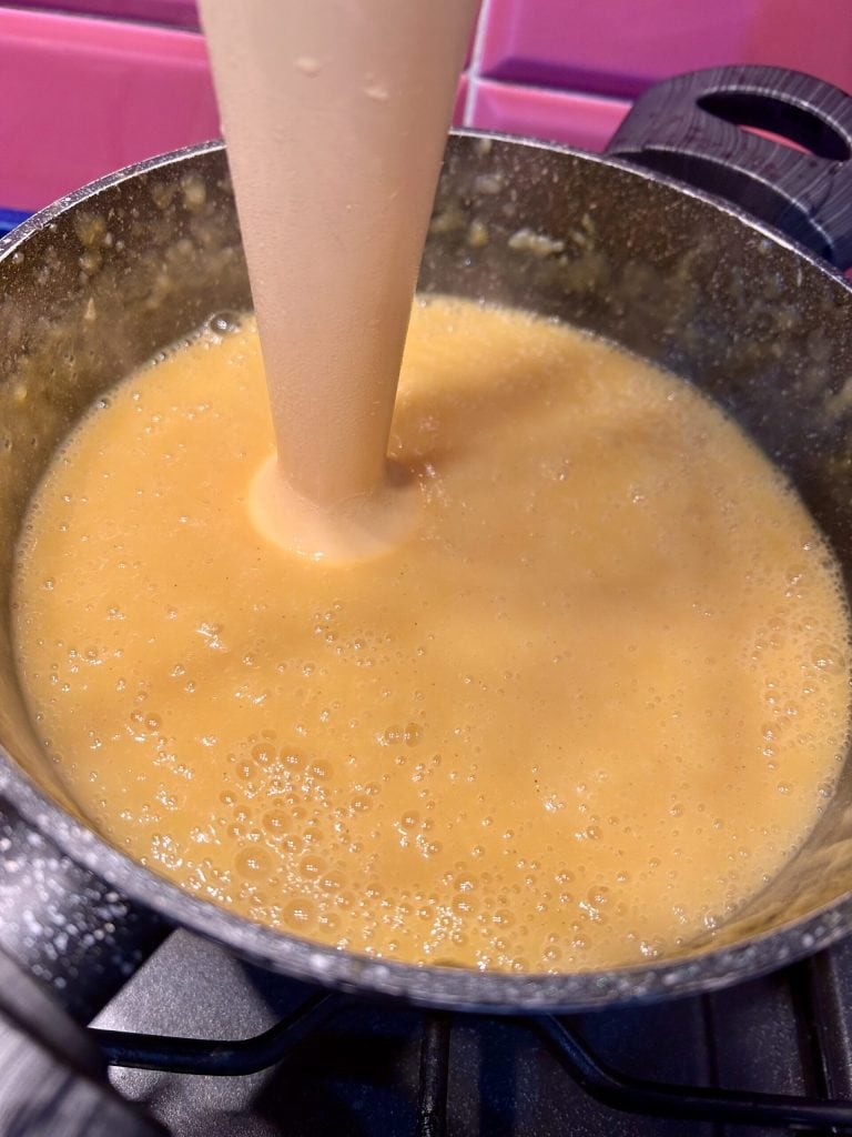 Para cozinhar a creme, utilizei uma panela de bordas altas com 24 cm de diâmetro, e para bater, utilizei um mixer de imersão para que pudesse bater diretamente na panela.